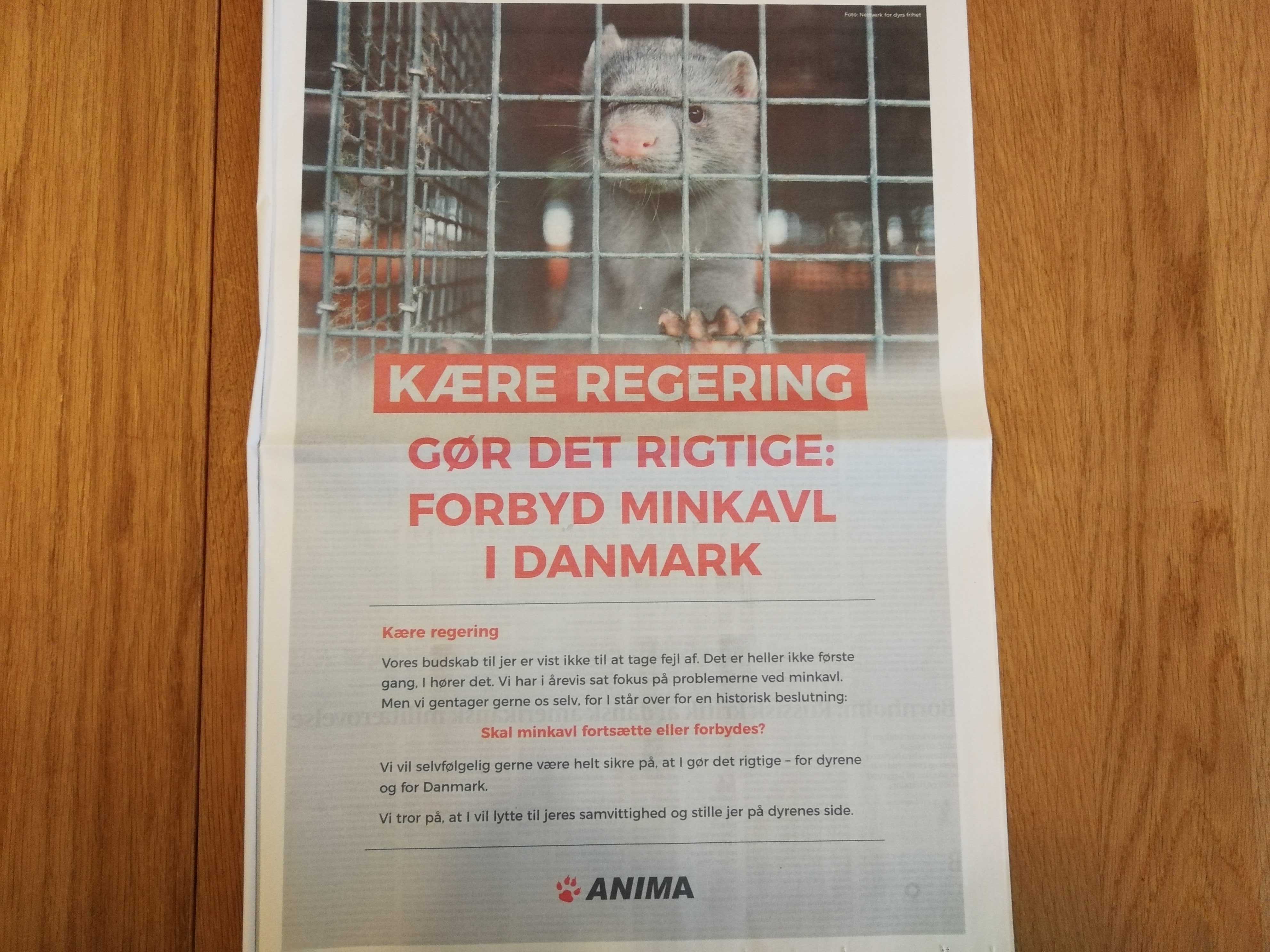 Selv når politikerne åbner deres avis om morgenen, vil de støde på Animas budskab. Vi har nemlig indrykket et åbent brev i Politiken, hvor vi opfordrer regeringen til at stille sig på dyrenes side. Vi leverede et eksemplar til hver eneste medlem af Socialdemokratiets folketingsgruppe.