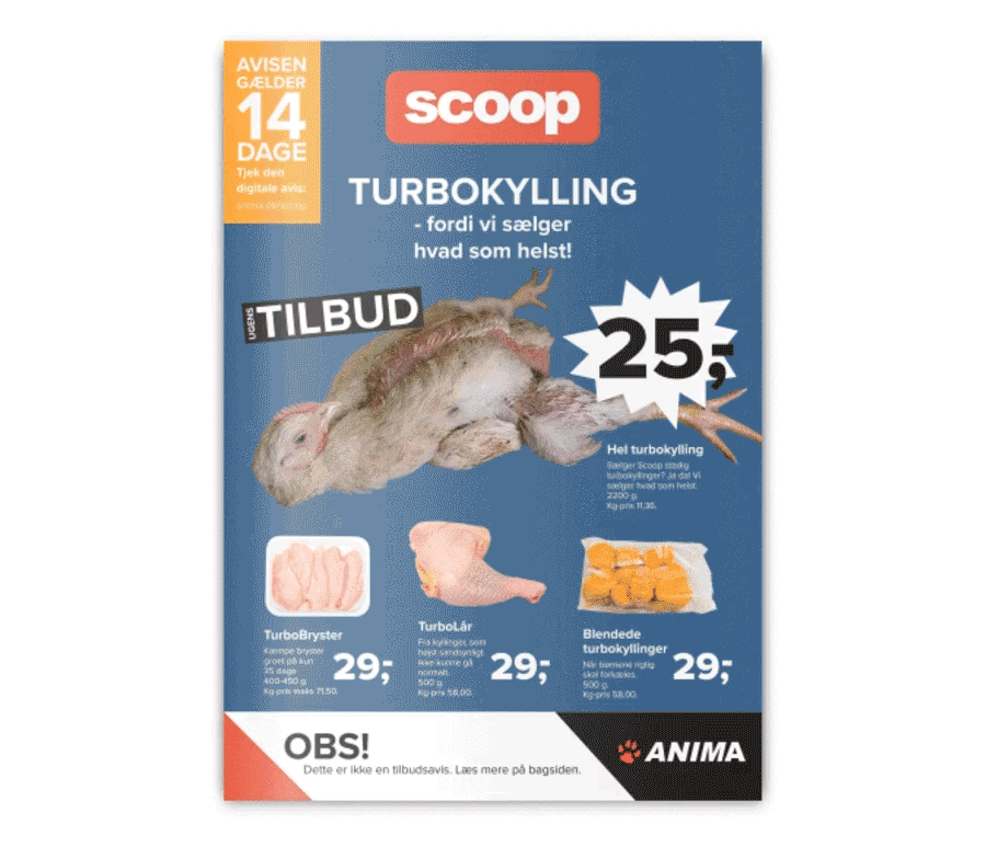 Frivillige for Anima har i en stor, koordineret aktion placeret tilbudsavisen i omkring 200 Coop-butikker i hele landet den 18. og 19. november. Samtidig kører reklamevideoen for Scoop lige nu for fuld hammer som annonce på sociale medier.