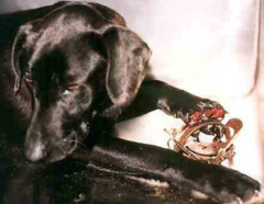 Forbipasserende lagde mærke til, at hunden manglede en del af sit ben, da den stejfede om. Knoglen stak ud af benet, og hunden havde flere sår. Hunden Jeannie skal nu have en del af sit ben ambuteret efter at have siddet fast i fælden.
