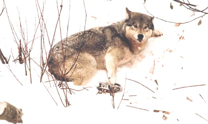 Ulvens kamp var tydelig i flere meter rundt om træstolpen, hvor fælden var sat fast. Sneen var dækket af træsplinter, klumper af is, og blodstænk. Men dette engang kraftfulde dyr var færdig med at kæmpe. Dens øjne iagttog os, men den var for træt til at holde hovedet op og følge vores bevægelser. Dens vejrtrækning var overfladisk. Vi tænkte på, hvor længe den havde været der og stirret sin langsomme og smertefulde død i øjnene. Der er ingen lovgivning, der stiller krav om, hvor ofte fangere skal tjekke deres fælder.