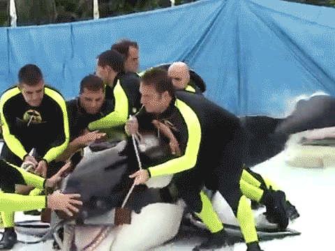 "I fangenskab er spækhuggerne totalt afhængige af deres træner for at få stillet deres sult. Ved hjælp af madkontrol manipulerer man spækhuggerne til at gøre unaturlige ting som at ”danse” i takt til popmusik. Kun når spækhuggerne udfører trænerens kommando korrekt, får de en madbelønning," forklarer Ric'O Barry, delfinekspert og grundlægger af Dolphin Project.